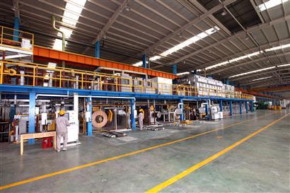 自主研发了国内唯一铜带自动化生产线, 长200米,铜带从开平、打磨、着色、清洗、烤漆、封釉,全部在自动生产线完成